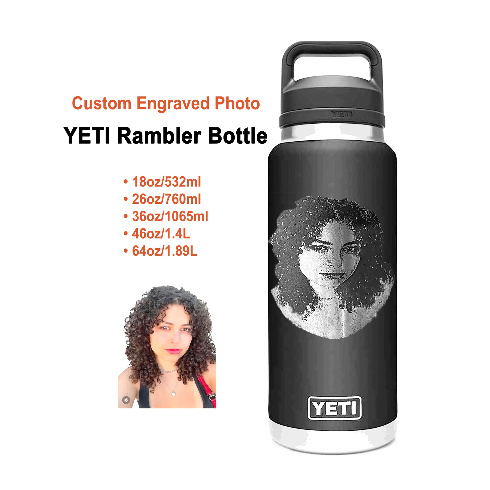 The YETI RAMBLER Drink Bottles with Chug Cap Range Custom Engraved with Photos is Perfect for any occasion and gifts - end of the year holiday, personalised anniversary, godmother gift, bridesmaid tumbler, or a valentines gift. They will love it.